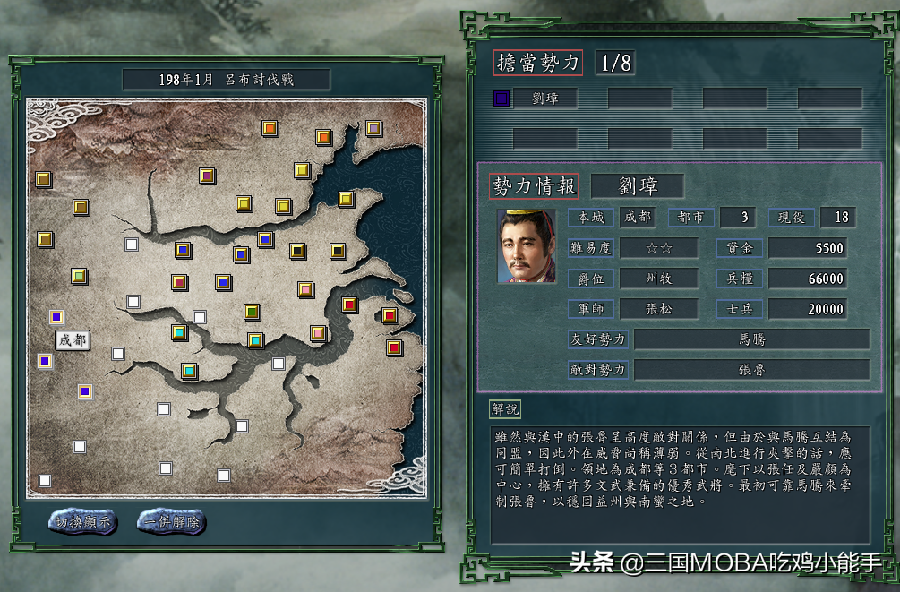 所以,对于三国志11来说,不时出现各种萌新玩家,也并不是一件很稀奇的事情。对此,对于刚进新手村的玩家来说,在游戏里选择一个合适自己的势力还是很有必要的,操作难度不能太高,否则很容易翻车,于此同时选择的势力也不能太过强大,否则都市太多,操作起来会比较麻烦,不利于体验。在游戏里这么多的剧本势力中,个人建议还是从以下4个势力中选。