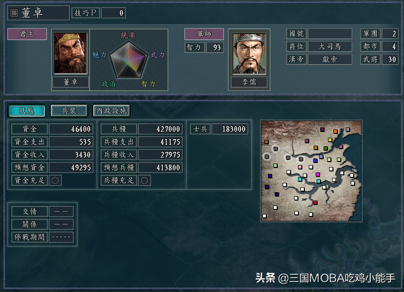 第四是,地理位置不错,虽然《群雄割据》中曹操是处于陈留,但是西面都是空城,没有敌军压力,相邻的袁绍虽然强大,但却跟曹操关系特好,是处于同盟关系,不仅很少会翻脸打仗,而且还是自己的强援。