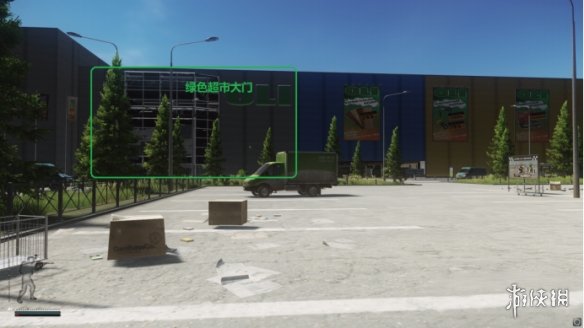 这里以正门为中间,左边为蓝色超市,右边为绿色超市。