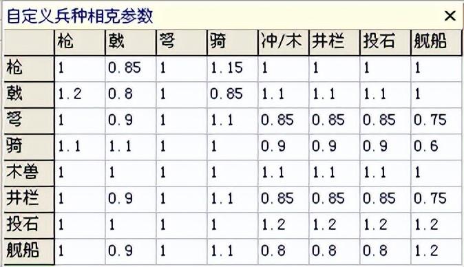 测试之前,先把兵种的克制参数修改了一下,让各个兵种在攻击弩兵的时候,都是100%伤害。