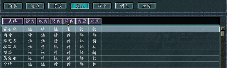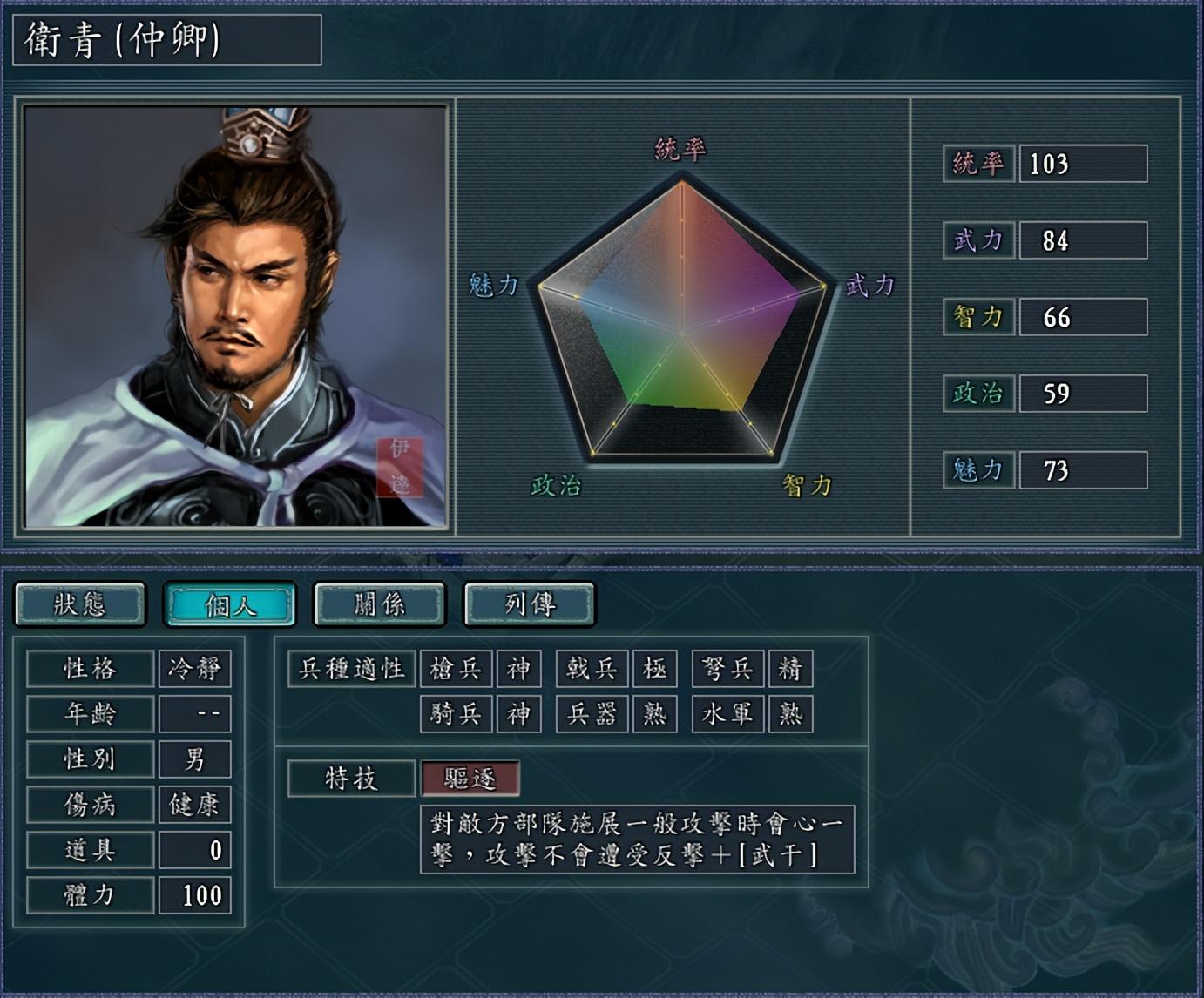 卫青拥有四人中最高的统率值,而且是骑、枪双神(S+1)适性。