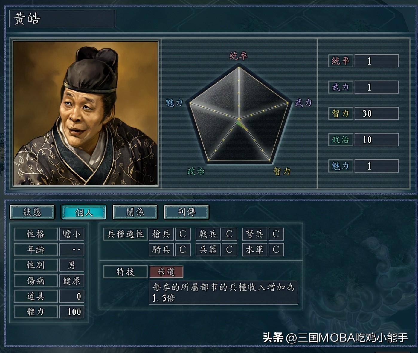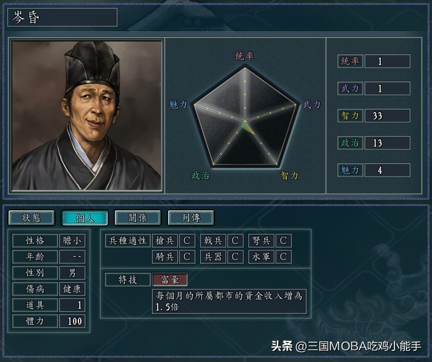 黄皓和岑昏是三国里面两个臭名昭著的太监,一个是祸害了蜀汉,一个是祸害了东吴,直接或间接导致了两个国家的灭亡,所以这二位在游戏里的评价和定位也是非常低的,不仔细看还以为是两个双胞胎兄弟,属性和头像都非常相像。都是各项属性超低,而且头像也设计得非常搓。