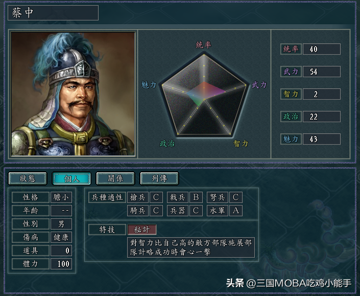 蔡中和蔡和由于在演义中被周瑜耍得团团转,直接导致曹操赤壁战败。所以在游戏里智力被设定得极低,分别是1和2,这两兄弟的智力设定也颇具喜感,让人忍俊不禁,对此也有玩家将这二位称之为“中和二仙”,如果真的要想将这二位拔高到“仙”的境界,其实给其配上特技“秘计”无疑瞬间就能达到效果,因为秘计是武将的智力越低越厉害,如果再让其跟曹操组队,那么几乎有等同于“曹操+司马懿”的效果,真的特别厉害!