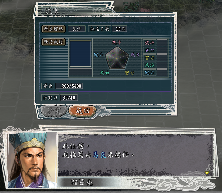然后诸葛亮推荐了马良执行流言操作。诸葛亮说话是非常靠谱的,除了在招募有亲密、厌恶关系的敌将的时候会出现错误,其他都是言之必中。