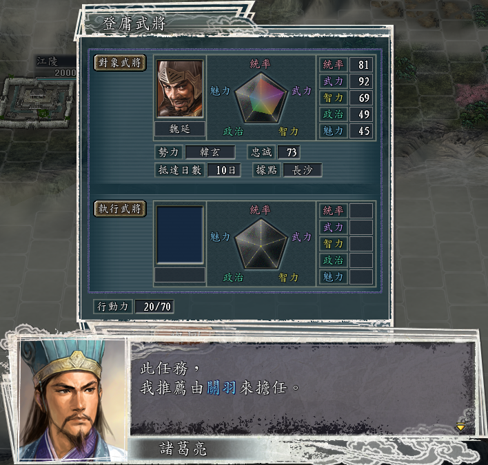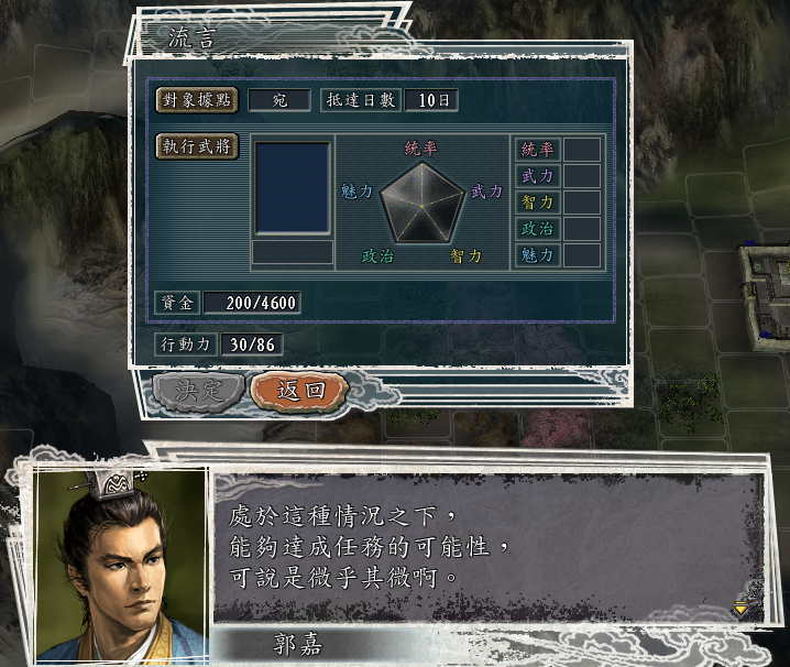 再次,就是要关注敌城的将领属性。因为流言大法是施法对象,实际上是“目标城中驻守的将领中的智力最高者”。如果目标城中所有武将智力都被碾压,那就罢了,直接上。如果说有比较棘手的,那就得用上“引兵大法”了。