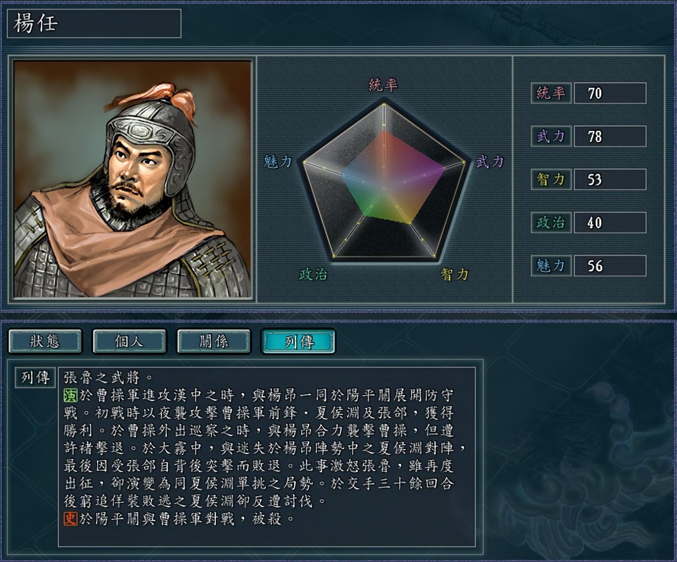 这是杨任的主要战绩,能与夏侯渊力战三十余合,说明还是有两把刷子的。虽然随后中了拖刀计被斩,但是以前面的表现来看,也不算是毫无战力的杂鱼。