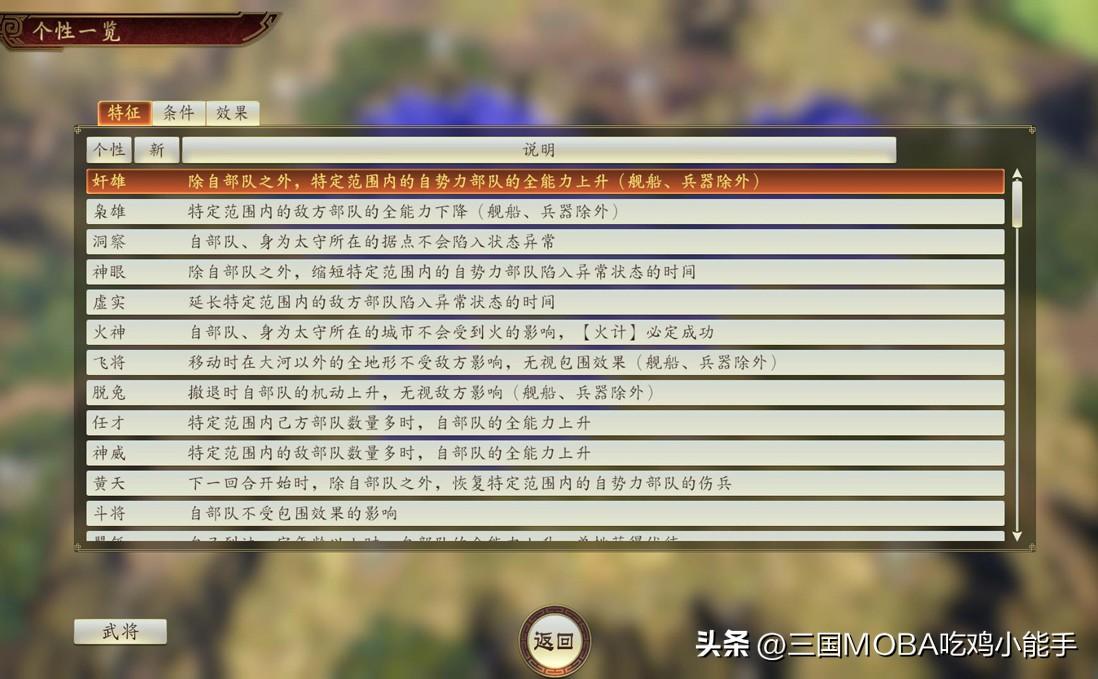 这里面需要特别注意的是,游戏里武将的个性有3大分类,分别是金色个性,蓝色个性和红色个性,其中金色个性较为特殊,效果往往极佳,有点类似于神技的感觉,而蓝色个性的效果虽然相对差一些,但往往也非常不错,多个搭配起来也很实用,但是红色个性却不太行了,是一个负面个性,比如张飞和吕布的个性“莽撞”就是一个典型的负面个性,特别影响他们战场上的发挥,经常会因为这个特技出现送人头的情况。