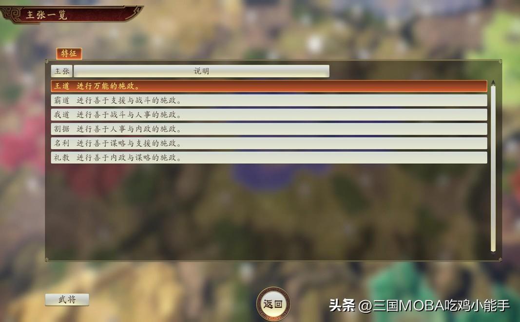 游戏里每个武将都是有主张设定的,不过这个主张设定只作用于君主,普通武将这个设定没有作用。游戏里总共有“王道”,“霸道”,“我道”,“割据”,“名利”和“礼教”这6类主张,由于游戏比较偏向于战斗和内政,所以个人认为,“霸道”和“我道”这两个类型的主张效果最好,“王道”效果相对中庸,而“割据”,“名利”和“礼教”则比较拉胯。