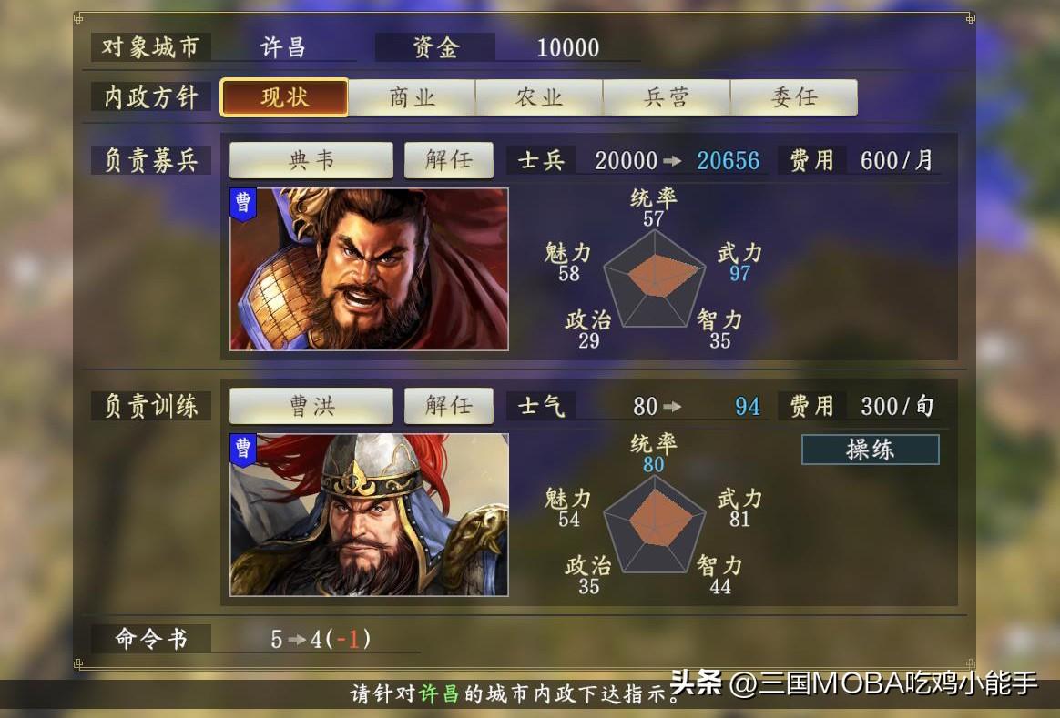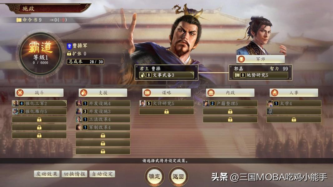 在势力的施政政策上面,共有战斗,支援,谋略,内政和人事这5大类型,在每个类型下面,也有各种小的政策类型设定,游戏里所有的武将都有这种小的政策设定,武将的政策能力同样是非常重要的。游戏里也有不少武将有极强的政策设定,这个设定对于势力的综合战力提升来说同样是非常重要的。游戏里,孙坚和吕布的“强化三军”,张角刘备的“经世济民”等等无疑就是顶级的政策能力。这里还需要特别一提的是,势力的君主和军师不占施政成本,所以势力下的这两个角色的能力非常特殊。