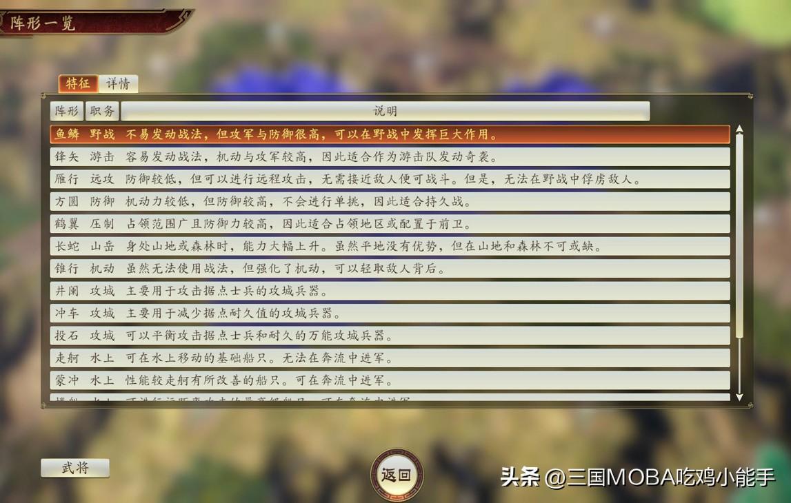三国志14里武将没有兵种适性,取而代之的是武将的阵型设定,游戏里共有“鱼鳞,锋矢,雁行,方圆,鹤翼,长蛇,锥行,井栏,冲车,投石”这10种阵型,游戏里所有的武将都有自己所拿手的阵型设定,就算是再拉胯的武将,都能找到自己适合的阵型出征,不像11代,很多垃圾武将的兵种适性全部都是C。