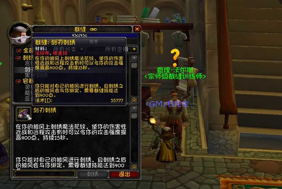 讲完洗布然后看一下80级的裁缝专业收益,属性方面裁缝有一个披风专属刺绣附魔,分别可以提高法强295点、攻强400点和回蓝400点,内置CD是45秒。