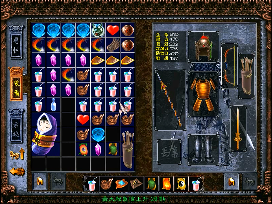 捡阿斗时,把背包空余一点位置出来,捡起来能增加20点杀气。不知道这里如果背包位置不够,还能不能捡起来。下次测试一下
