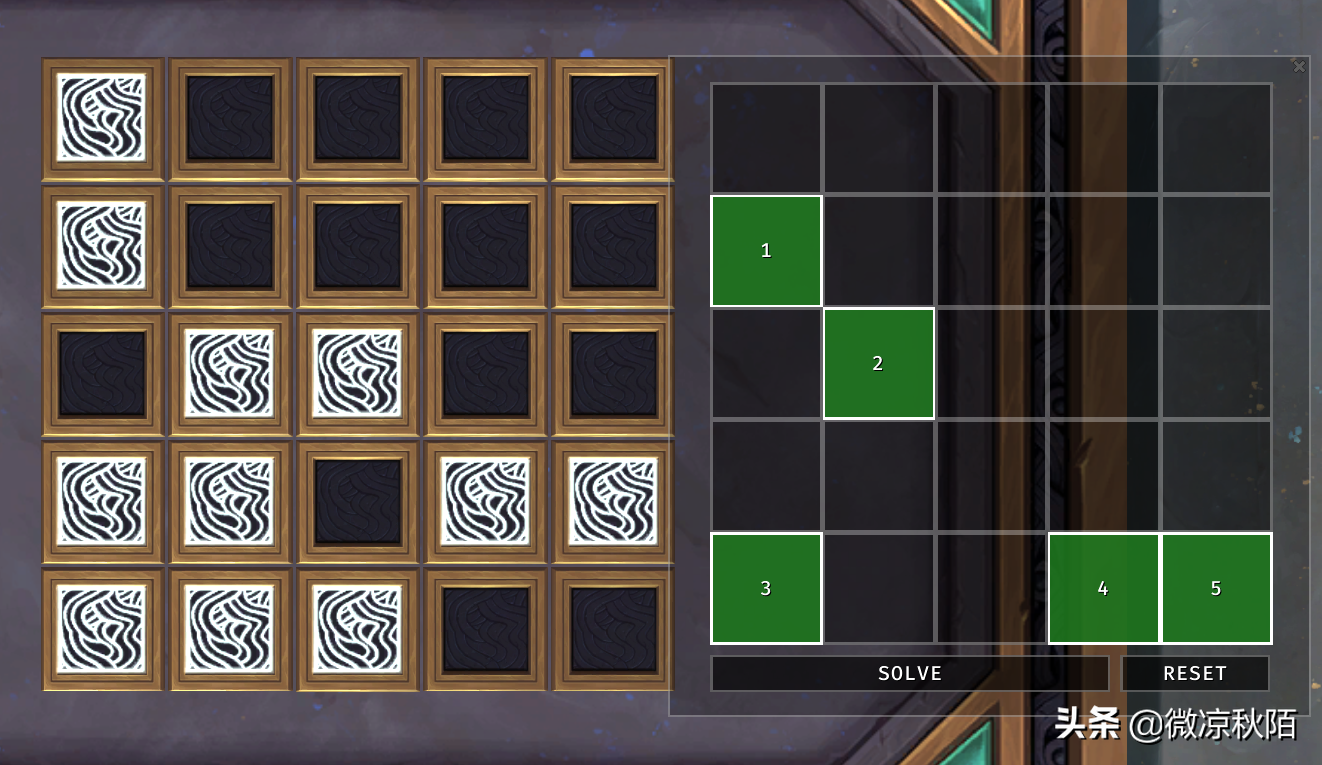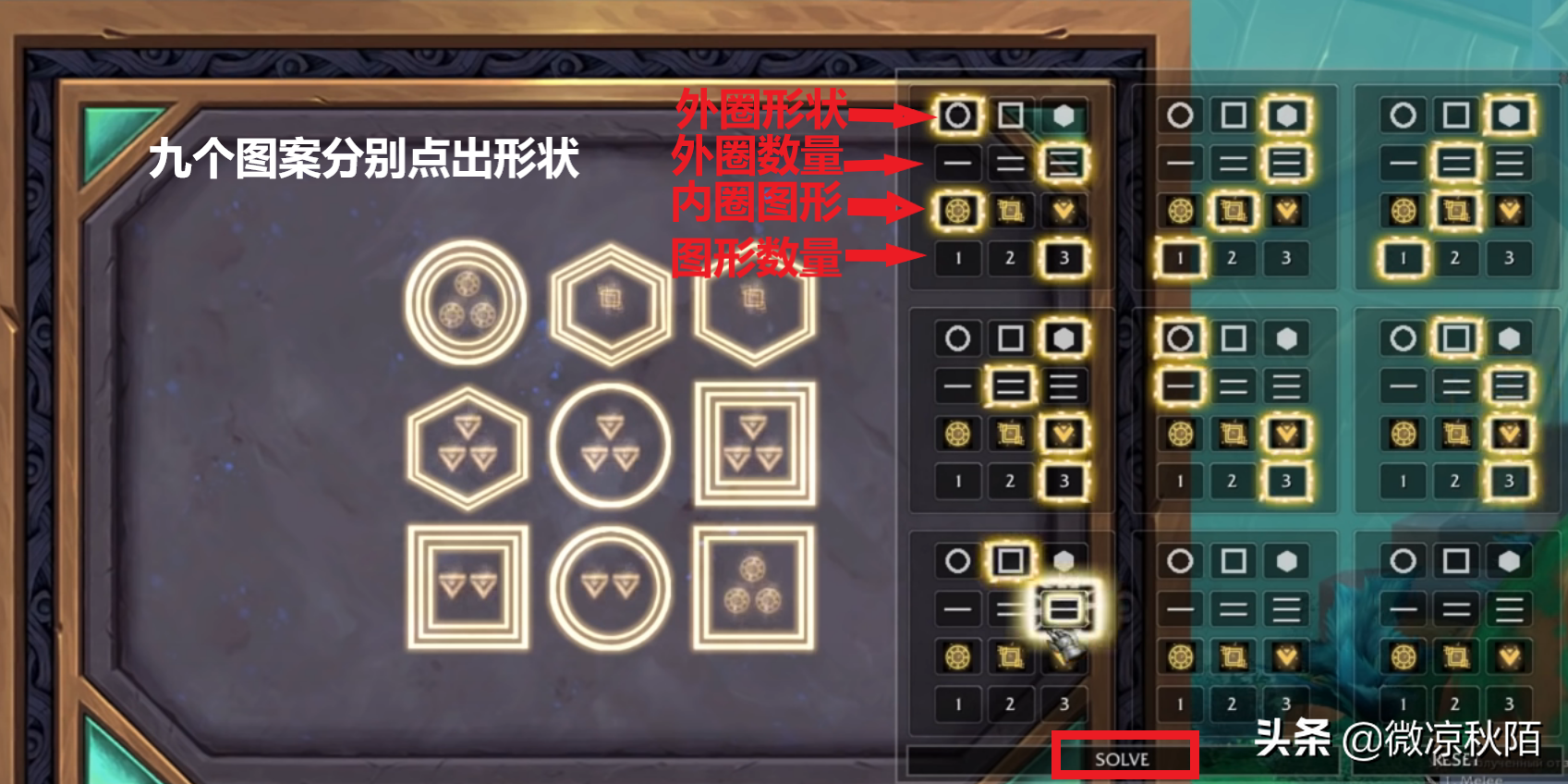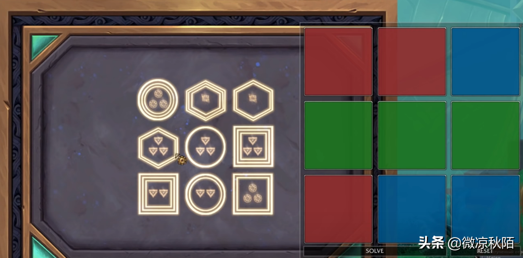 这是能难倒大部分玩家的解谜宝箱,只要在插件界面按照顺序点出图形的外观,插件就能显示九个三组可以直接消除的图形,这能节省大量的时间。其他的几个图形倒是无须插件的辅助,规则较为简单。