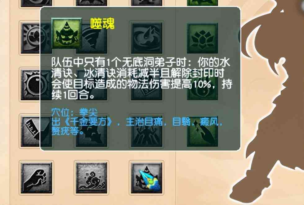 另外在于部分门派的经脉有配合,比如五庄、天机城的破血,花果山的弱点,魔化生的琴音。