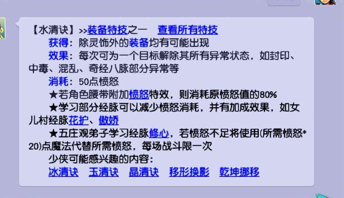 水清是解除异常状态消耗愤怒最低的,正常50,愤怒腰带40,无底洞点了6丹只要20,随便放。毫无疑问是所有特技中,优先级最高的。