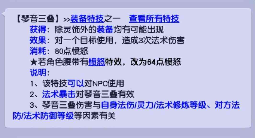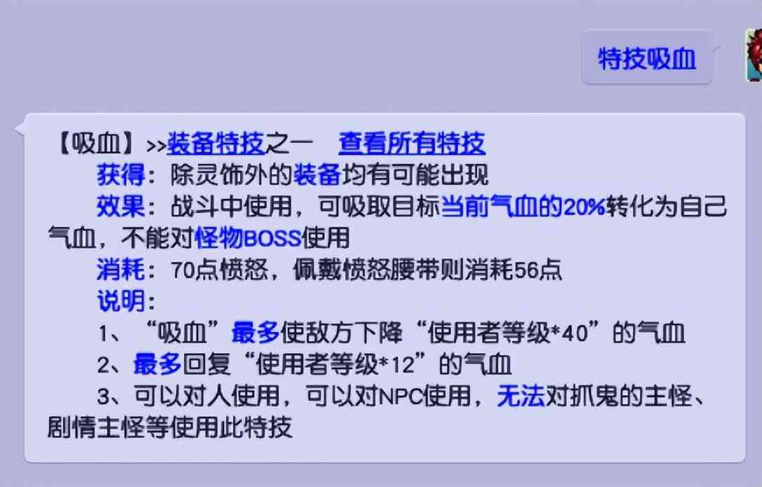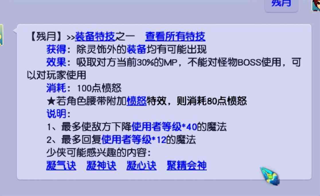 这四个特技中,当属残月最好用,NPC的蓝量都是99999,保证一口吸满。