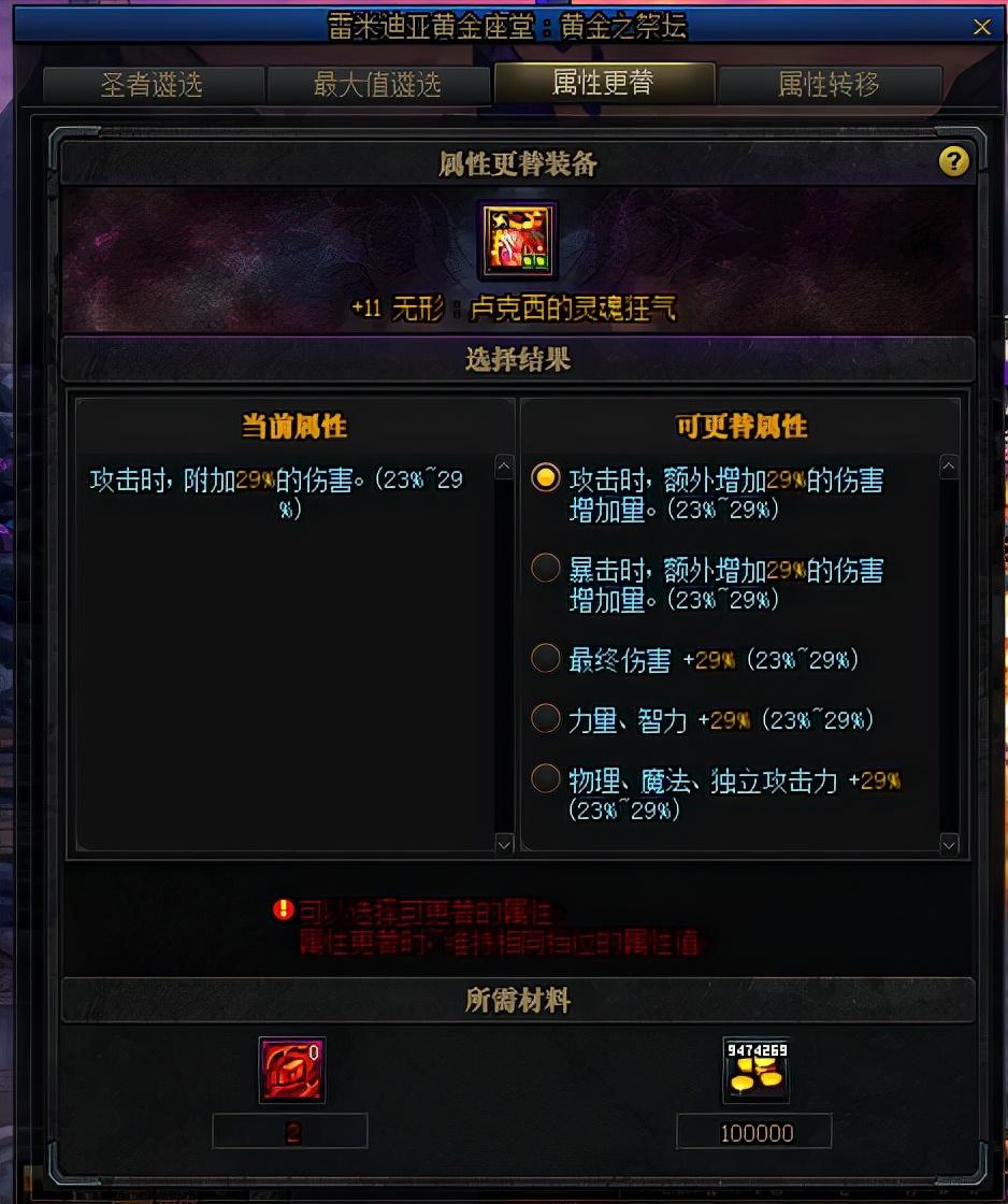 在减负版本更新后,恐怖之瞳不只可用于最大值遴选,也可以用于属性替换。属性替换可以使用两个恐怖之瞳和十万金币将现有的遴选属性变更为同百分比的其他属性,上述操作均在NPC朱蒂·灵伍德处进行。