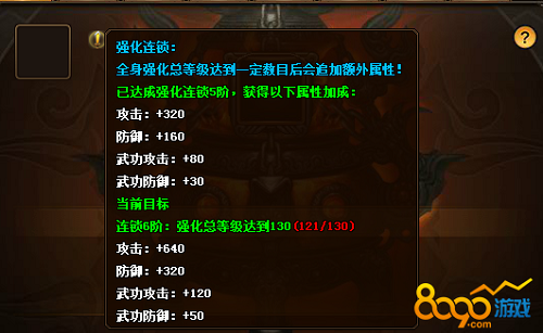 8090新热血江湖中的强化功能在玩家等级达到37级时开启,当装备强化总等级达到一定要求时就可以激活和加成属性。强化连锁分6阶段,每个阶段会加成一定的属性,每个阶段要的强化总等级都不一样,最高是6阶也就是要求装备总强化等级到达130级,6阶加成的属性是最多的。