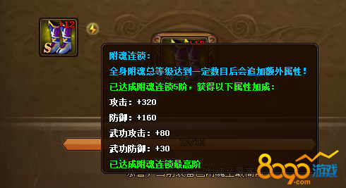 装备附魂的开启要求比较高,需要玩家等级达到80方可开启,武勋装备附魂强化总等级到达一定的要求就可以激活和加成属性,附魂连锁分5阶段,每个阶段会加成一定的属性,每个阶段要的镶嵌总等级都不一样,越往上要求的总等级越高,每个阶段的加成的属性也随阶数增加。