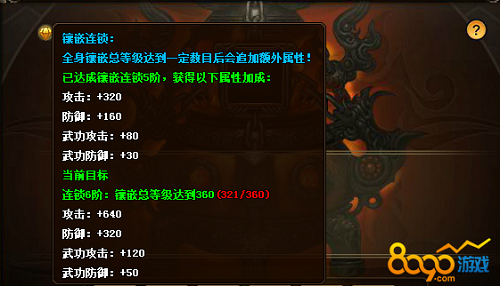镶嵌功能同样是37级开启,镶嵌连锁激活要求是装备宝石镶嵌总等级达到一定要求就可以激活和加成属性,难度较强化连锁要低些。镶嵌连锁分6阶段,每个阶段会加成一定的属性,每个阶段要的镶嵌总等级都不一样,越往上要求的总等级越高,每个阶段的加成的属性也随阶数增加。