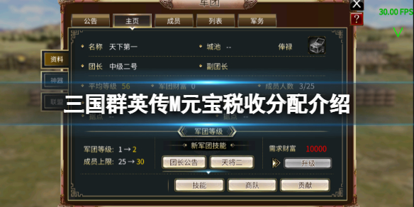 在军团系统奖励中,元宝可以通过比例设置调整元宝的配比,那么接下来就带给各位玩家们三国群英传M元宝税收分配介绍,感兴趣的玩家们不要错过,一起来看看吧。