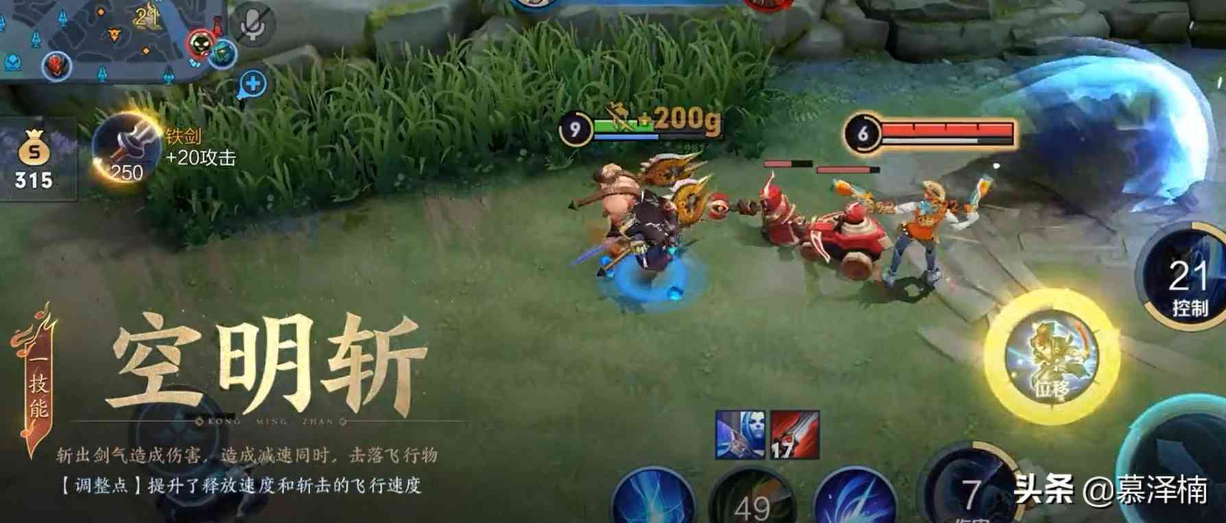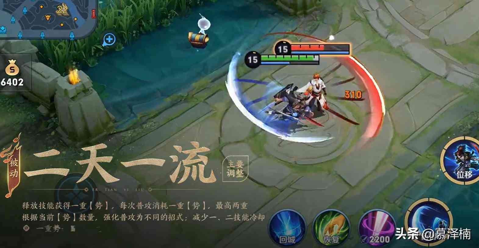 被动:宫本武藏释放技能后会蓄1重势,每次普攻消耗1重势,获得不同的强化效果,强化普攻不受攻速影响,命中后减少【空明斩】和【神速】1秒冷却时间。 一重势:若目标生命在50%以上,宫本武藏双刀挥斩,造成两段伤害,若目标生命在50%以下,宫本武藏向前正斩,造成斩杀伤害; 二重势:宫本武藏挥刀突进至目标身前,造成伤害和减速。