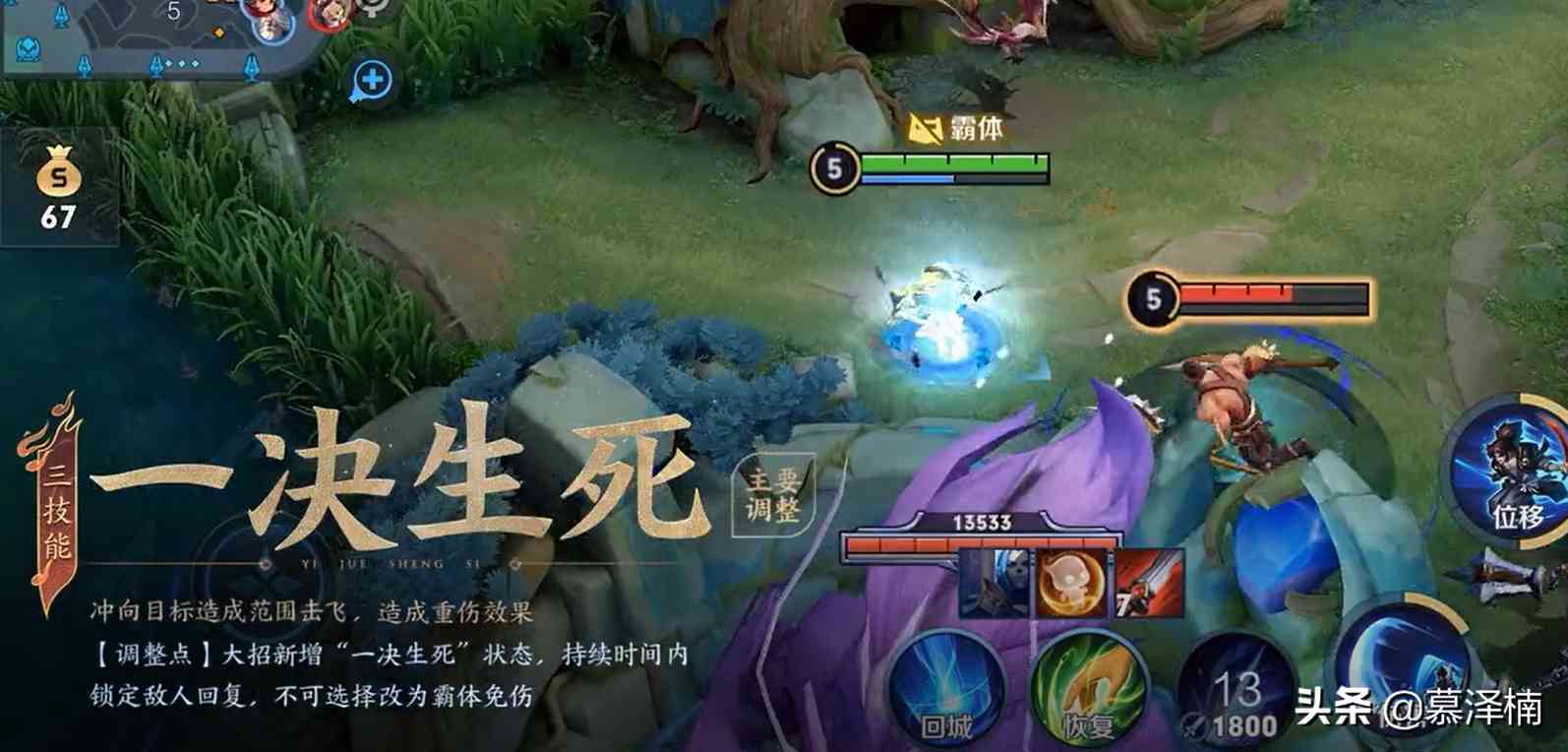 三技能:宫本武藏选择并锁定一名敌方英雄,向目标所在区域突进,对范围内的目标造成伤害和击飞,随后目标被宫本指明为一决生死的对象,持续5秒,期间对象所有恢复效果都会延迟到一决生死后生效。 宫本武藏在突进期间处于霸体状态,并减少50%所受伤害。
