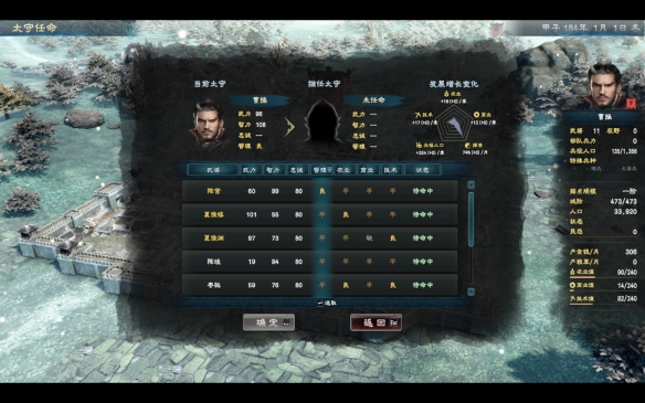 一个据点中可以任命5位内政幕僚,其中武将的智力影响据点的五维平均发展。务农影响农业值、经商影响商业值、技工影响工业值。任命时我们以智力以及农、商、技三项的高低来选择幕僚即可。