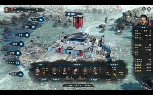 游戏中的内政系统分为太守任命和内政幕僚任命。太守和内政幕僚会提升据点的各项发展数值。