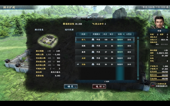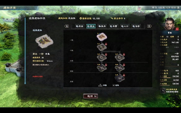 任命完幕僚、太守后,可以先对据点内的空地进行建设。玩家能够从农业、商业、技术、兵营、人口、治安这些类别的建筑中选择设施搭建。