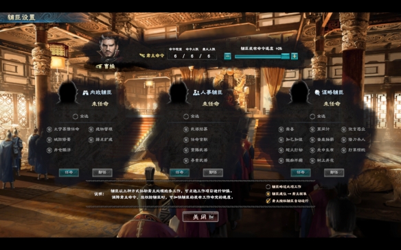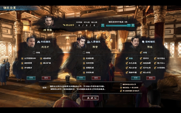 进入[辅臣设置]界面,我们可以安排内政、人事、谋略三名辅臣,选择辅臣一般看的是对应的辅臣特性、智力以及行动力,其中行动力越高辅臣安排工作的速率就越快。