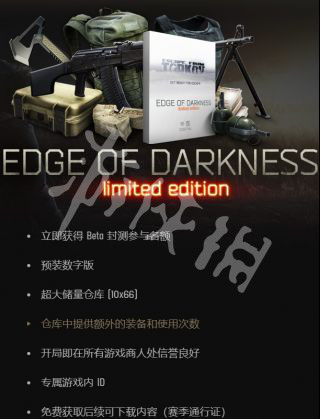 游戏目前有四个版本:分别是标准版(俗称白边)、留守版、准备逃生版和黑暗边缘限定版(俗称黑边),价格依次是245、407、561和772,单位是人民币,价格可能会随着汇率有所浮动,四个版本之间的差别无非是仓库大小和保险箱。这些价格都是买欧服的最低价格。