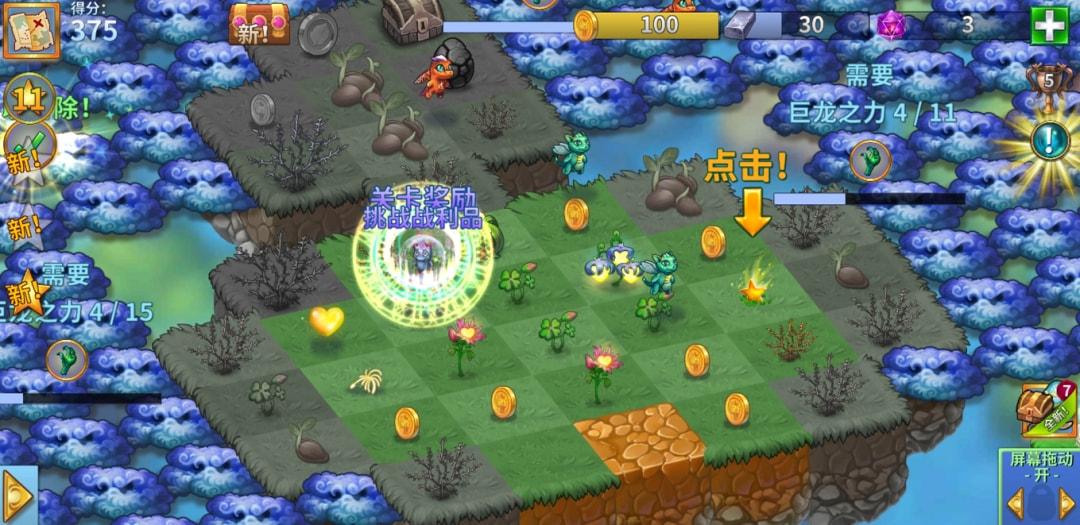 从实际游戏体验来看,《萌龙进化论》是一款将合成与养成玩法完美融合的产品。游戏主要围绕着关卡和营地两种模式进行,在两种模式中,玩家都可以通过拖拽将三个相邻的同一元素合成新的元素,比如三颗生命之花幼芽合成一颗生命之花,三个龙蛋合成一条龙,其中不同的龙又有不同的作用,比如青草龙可以采集生命之花获得有净化土地作用的生命精华、岩石龙可以采集荆棘获取生命之花幼苗等。