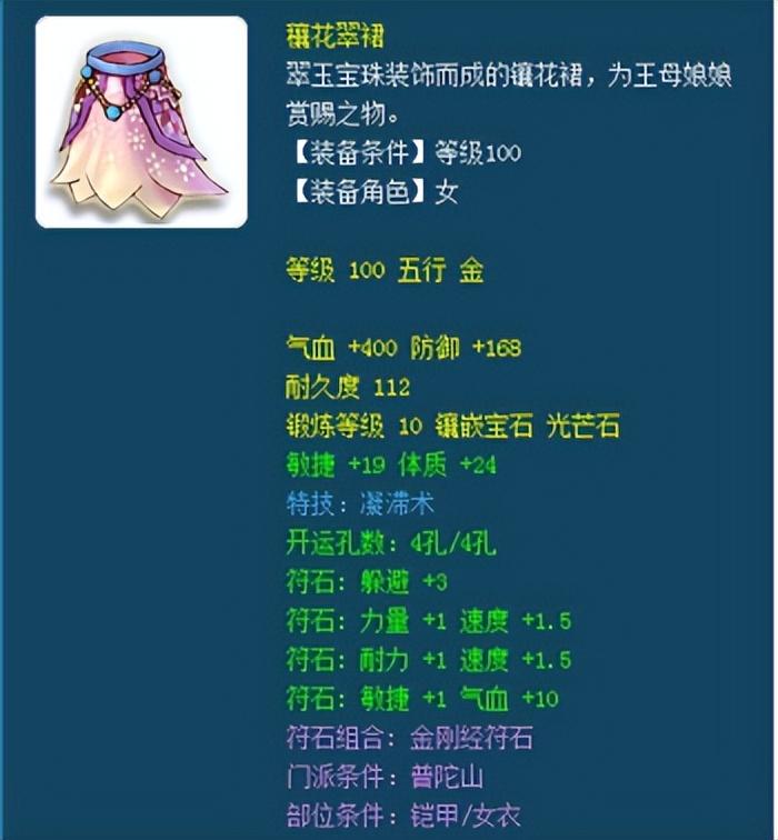 这件100级的女衣看起来就不错,双加很养眼敏捷19点,体质24点。这对于普陀来说,是很大的诱惑,毕竟普陀真的很缺这两个属性。蓝字凝滞在这个版本也是一大亮点,毕竟现在是抢速度的时代,降低别人的速度间接的杀伤力真的很大。如果这个女衣在点化一个套装,最好是敏捷那就很理想了。