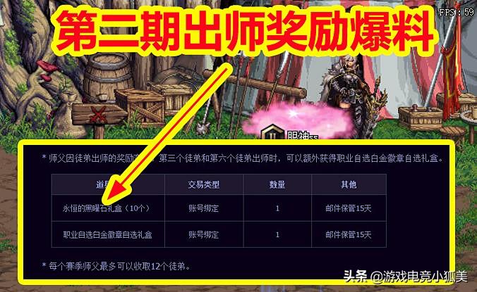 随着第二期是推活动降临国服之后,出师的奖励一直没有公布,这一次在国服11.14版本更新前夕,官网终于是给出了出师的奖励。每个玩家可以带12个徒弟,出师之后会送出账绑的普雷材料,而第三个、第六个徒弟还会送出一个白金徽章盒子。普雷武器可以轻松毕业了,平民玩家不打团也能拿到普雷武器的升级材料了。武器对于玩家的提升是非常大的。老规矩搞快点,直接上本次师徒出师的活动和奖励截图: