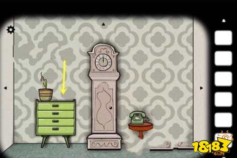 2、我们先是默认的面对有大型钟的这面,先点击盆栽柜子,在柜子抽屉里面我们能拿到火柴和勺子。接着我们点击右转镜头到另一面面对窗户的房间,打开墙上的灯泡按钮开灯,点击向上按钮,从天花板的灯罩里面取得一块相片碎片,接着回到窗户这里,再点击一次窗户,会飘出一片相片碎片。