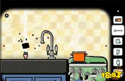 4、我们回到厨房,把锅装满水,调整一下旁边的煤气开关,用火柴点着火,再把锅放上去,水就会煮沸了,那颗蛋就能毫无顾虑的丢进去了,再拿出来,就显示的是煮熟的蛋了,此时你可以看到水龙头旁边有一个专门装蛋的架子,蛋放上去,用勺子敲碎壳,这时候!方块就出现了!点击多次,取得方块!