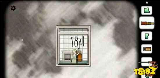 3、我们向右转,打开灯,依然是天花板灯盖里面,拿到钥匙,接着回到窗户这里,拉开窗帘,点近,用望远镜看月亮,发现可以一直放大,直到看到一场谋杀案,记下墙上的数字(1487)接着回到房间。