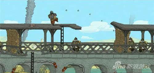 投掷砖块吸引下方士兵注意力。然后顺着梯子爬到桥下。