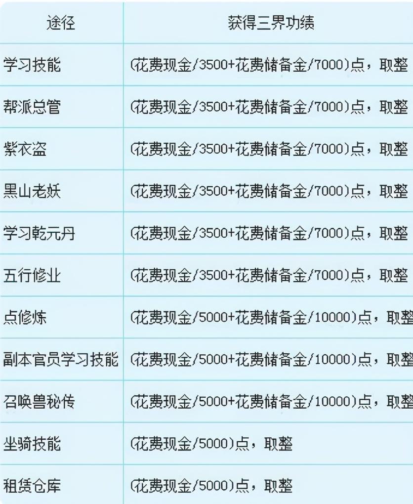 从上图可以看到,获取三界功绩的途径的确有不少。除了一些日常任务玩法之外,学习技能以及点修炼是三界功绩的主要渠道。其余的玩法也可以获得不同程度的三界功绩,例如黑山老妖、紫衣盗以及召唤兽秘传等,花费金钱以及储备金都是可以获得三界功绩的。可能大家忽略了一种获得三界功绩的玩法,如上图所示,坐骑技能学习也可以得到三界功绩。在使用现金学习坐骑技能的情况下,可以获得现金/5000的三界功绩。然而大家在点技能的时候使用了储备金,所以没有获得三界功绩。