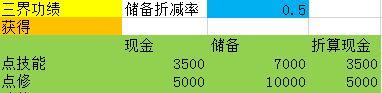 上图计算了点技能、点修、秘传的三界价值,我们可以看到在开储备的模式下,你的储备金其实是非常值钱的,也就是说储备金模式很不划算。以点技能为例,现金点技能获得三界为3500/点。而储备在0.857下的折算现金为5999,也就是说,光储备模式获得储备金情况下,不如直接拿现金点技能、点修。当然很少有玩家这么极端,除非是菜鸡新手,大部分玩家有自己套路获得储备,这个折减率会往下降。