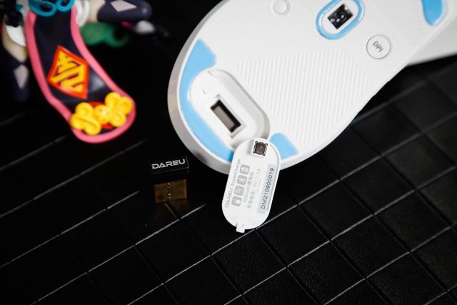 至于三种模式切换问题,达尔优也进行了科学设计,当我们需要2.4G无线连接时,我们只需要打开鼠标底部无线开关,并将接收器插入电脑,然后单击鼠标底部的模式切换按钮,观察指示灯为绿色时,即完成了2.4G无线模式的切换。