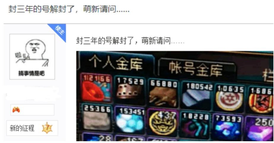 这不就有玩家账号被封了三年,谁也不知道这名玩家在这三年中经历了什么,好不容易熬到了三年解封的这一天。于是这名玩家赶紧登上这个阔别已久的账号,没想到官方竟然实现了承诺,被封三年的账号竟然真的解封了啊。不过已经有三年没有玩这游戏了,这仓库里面囤的这些道具材料也不知道还能值多少钱,于是这名玩家充满了期待的询问各位网友,而网友们给出的答案却很令人糟心。