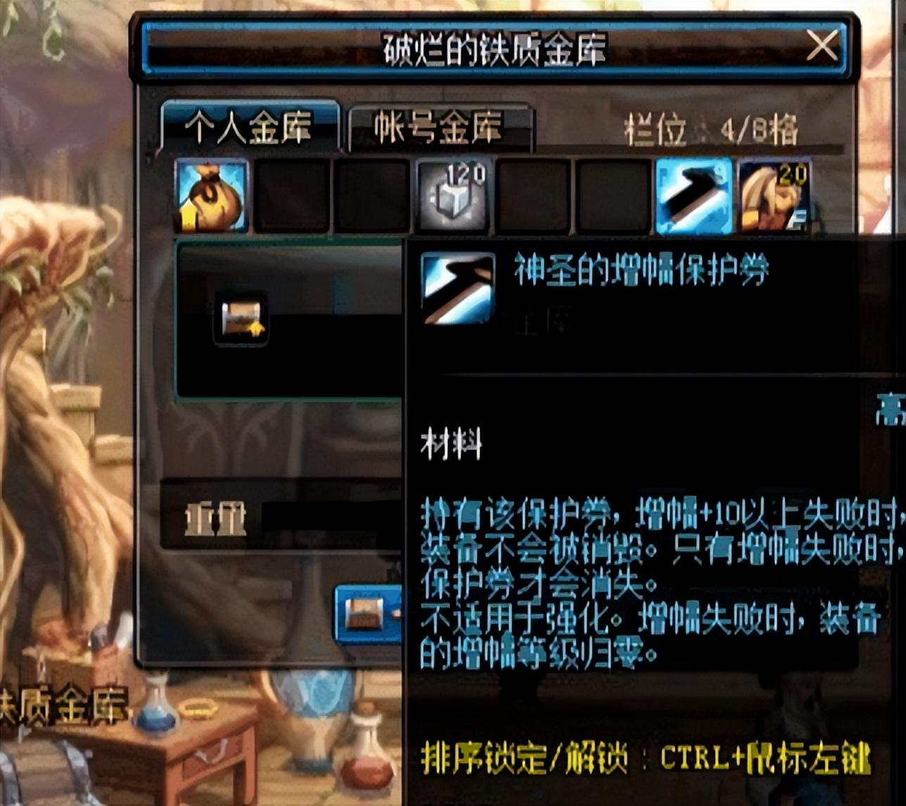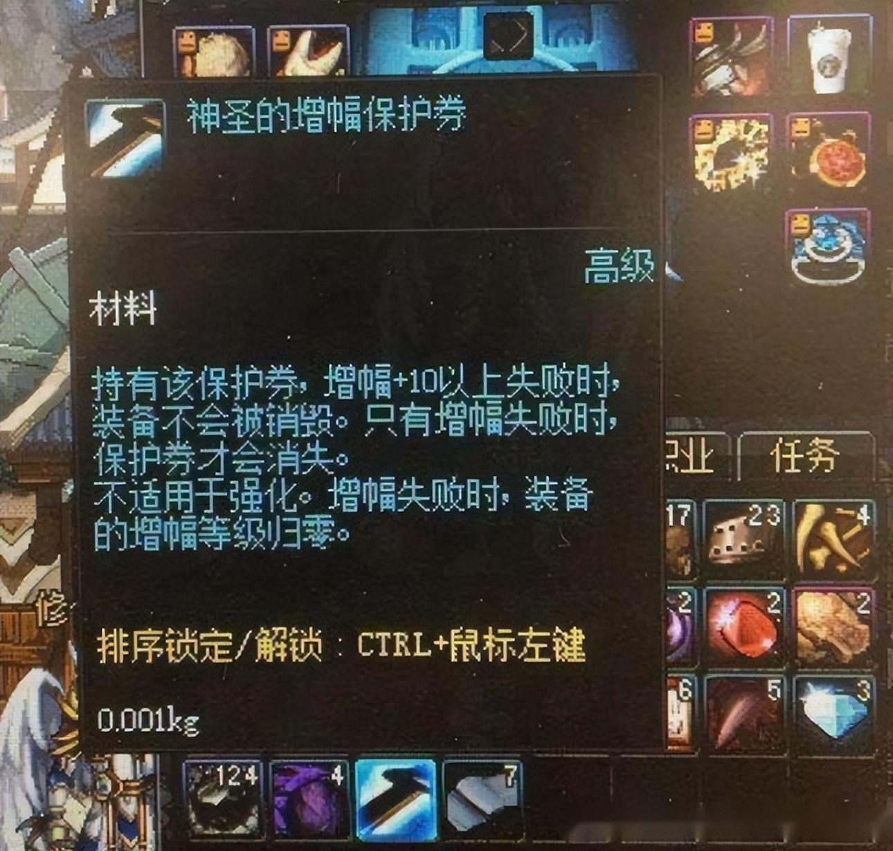 但让这名玩家意外的是,在小号的仓库里面竟发现了一个特殊的材料,这个材料的价值可就不一般了。这个材料就是这个神圣的增幅保护券,这和现在有期限只能交易一次的增幅保护券不同,这是地下城最原始的增幅保护券,可是没有各种限制的无期限增幅保护券。而这个保护券当年只卖几千点券,现在却已经是被炒到了十亿金币以上,而且往往还有价无市,有钱都买不到的。毕竟这个增幅保护券早已经是绝版了,可谓是用一张少一张,其收藏价值远远大于其实用价值啊。