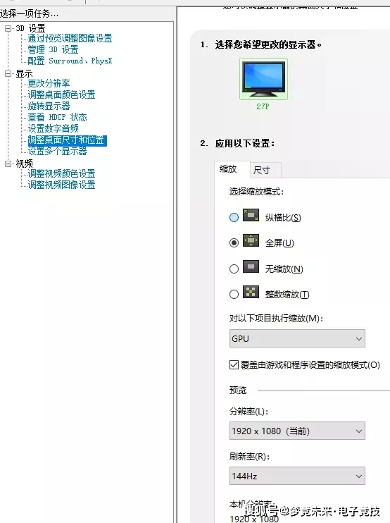 显示->调整桌面尺寸和位置->选择缩放模式->全屏或纵横比(拉伸用全屏、黑边用纵横比)->对以下项目执行缩放(M)->GPU(兼容性更好)->覆盖由游戏和程序设置的缩放模式(O),如图4所示。