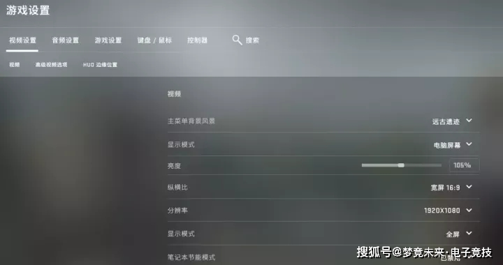 如图6,显示模式->电脑屏幕(不推荐选择“电视”)->亮度105%(因为CSGO存在BUG,除非修改cfg,其余设置中修改的亮度会在切回桌面后会自动改变。)->纵横比4:3或16:9->分辨率(详见下节)->显示模式(全屏)->笔记本节能模式(已禁用)