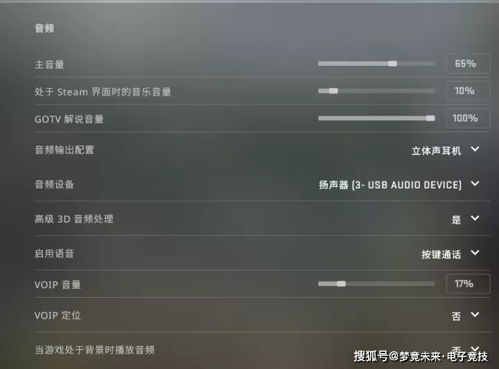主音量(控制整体音量;根据自己声音设备音量来调节,为了健康考虑不建议开太高)->音频输出配置(立体声耳机;不推荐使用虚拟7.1声道进行游戏)->音频设备(选择你自己的输出设备)->启用语音(按键通话;此项是CSGO游戏内与队友交流的语音)->VOIP音量(调整适中;此项决定了游戏内接收到的语音交流的音量大小)->