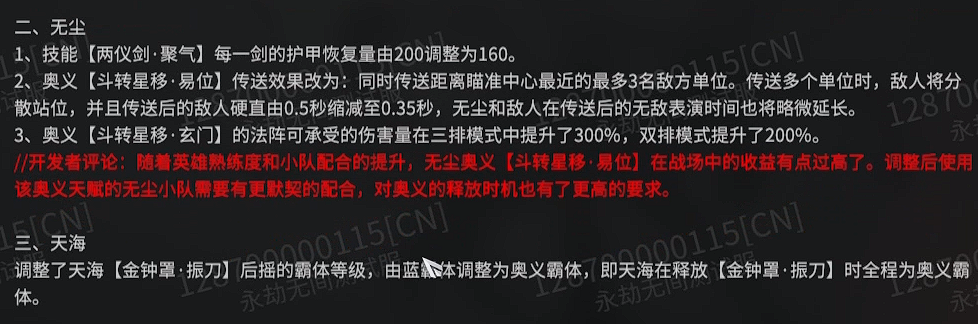 小幅削弱了无尘的奥义技能,毕竟他现在的奥义对很多英雄来说太难反制。
