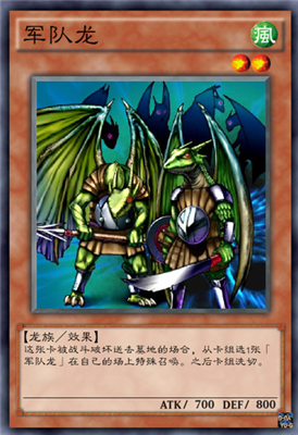 效果:这张卡被战斗破坏送去墓地时,从自己卡组把1只「军队龙」特殊召唤。