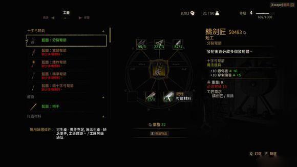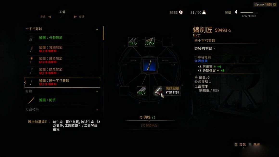 我的刷钱大法的前提是获得分裂弩箭和钝十字弓弩箭两张蓝图和足量的辅料(羽毛,木材之类的通用材料)及几块银块。如图,可见现在金钱为8000克朗,分裂弩箭的材料已经收集全了,银块是10块钝十字弓弩箭此时所需的精炼银矿数量为0